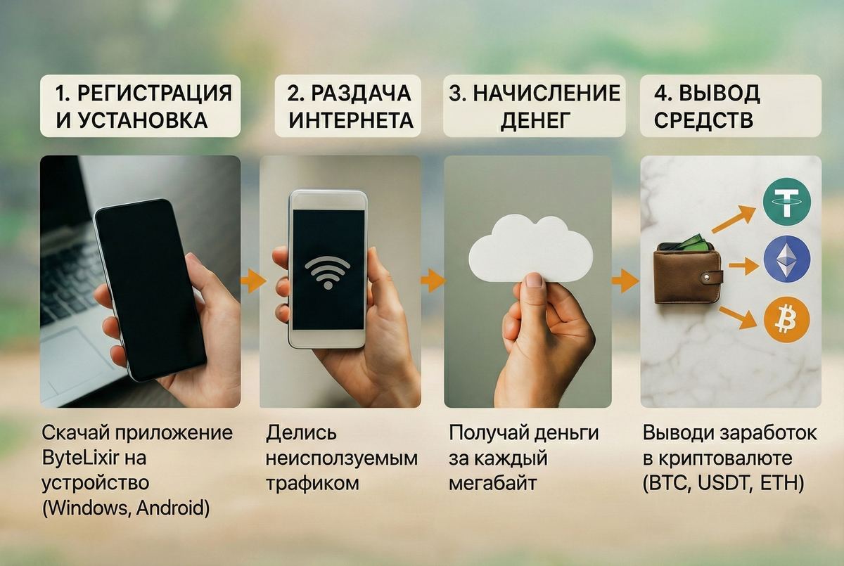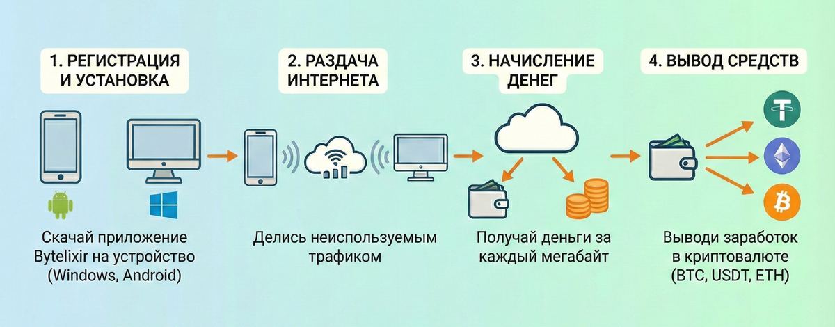 - Устанавливаешь приложение на Windows или Android → оно периодически «продаёт» небольшую часть твоего трафика проверенным компаниям.